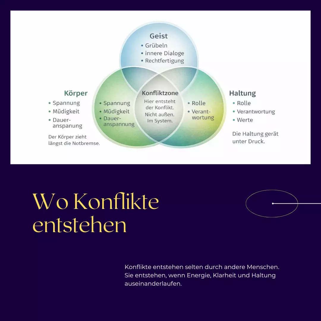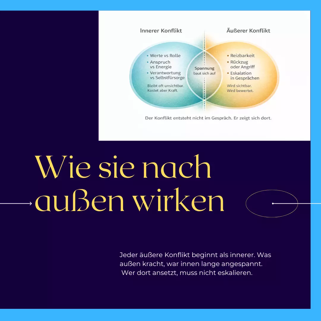 Der Konflikt entsteht innen, nicht außen. Was innen lange angespannt ist, zeigt sich irgendwann im Außen als Reizbarkeit, Rückzug oder Eskalation. Der Konflikt entsteht nicht im Gespräch – er zeigt sich dort.